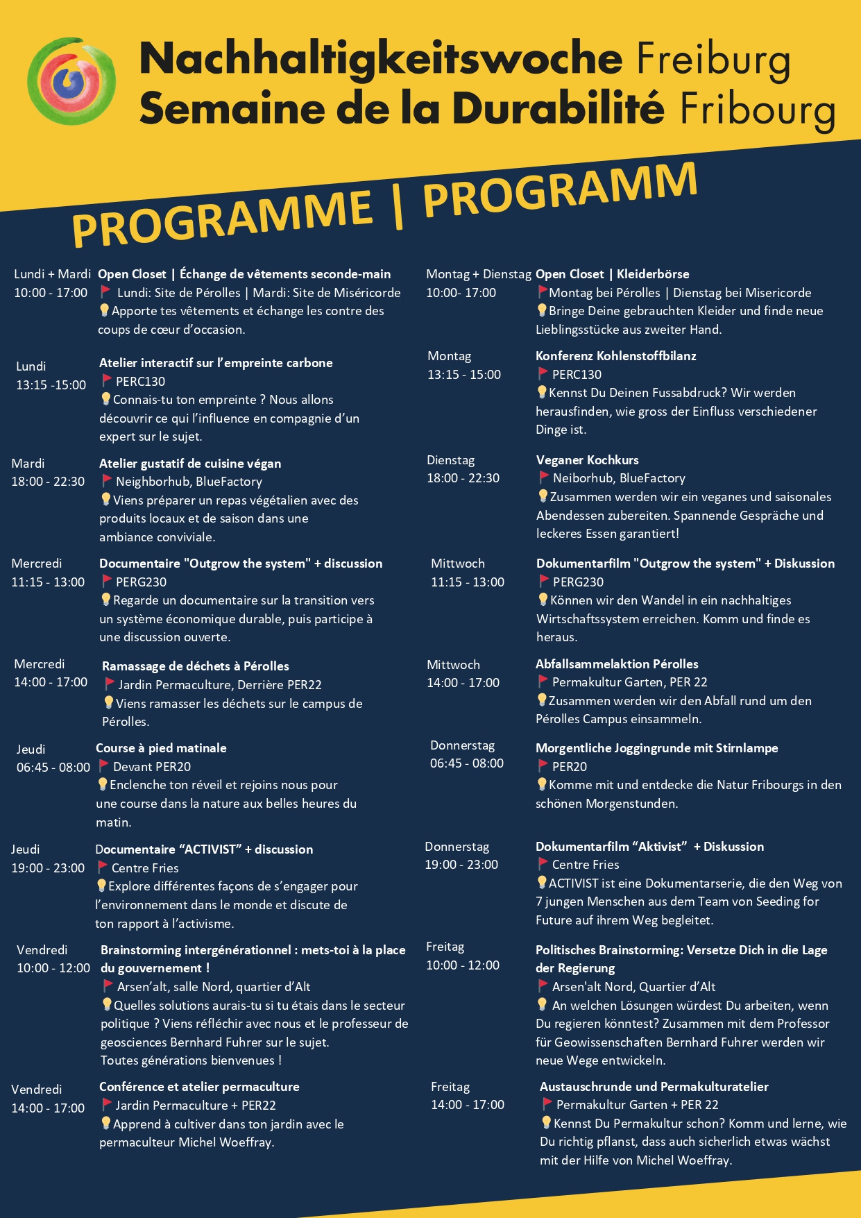 La semaine de la durabilité 2024 s'est tenue du 8 au 14 avril derniers. Elle avait pour but de sensibiliser les étudiant.e.s, les employé.e.s et le public fribourgeois aux questions liées à la durabilité en proposant des évènements variés et accessibles sur cette thématique. L'objectif est d'inspirer, éduquer et encourager les étudiant.e.s, les universitaires et le grand public à agir.
